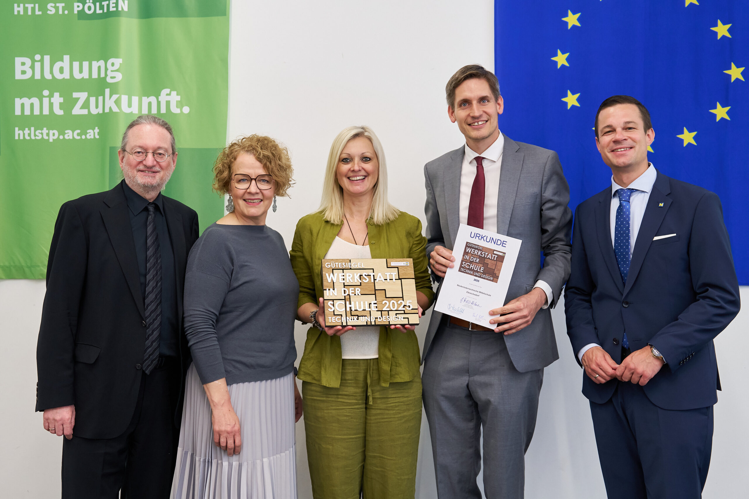 Bildbeschreibung: v.l.n.r.: FI Andreas Gruber, Landesrätin Christiane Teschl-Hofmeister, Mag. Nicole Heidenwolf, Direktor Dr. Stefan Petrovitz, Bildungsdirektor Karl Fritthum bei der Gütesiegelverleihung „Werkstatt in der Schule 2025“ in der HTL St. Pölten am 19.05.2025